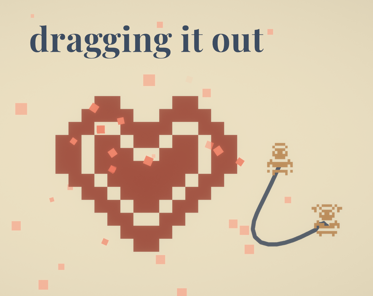 dragging it out is a short, autobiographical experience about the slow end of a relationship. It is a game about the growing distance between two people, and the quiet struggle to keep a love alive that has long since exhausted itself.